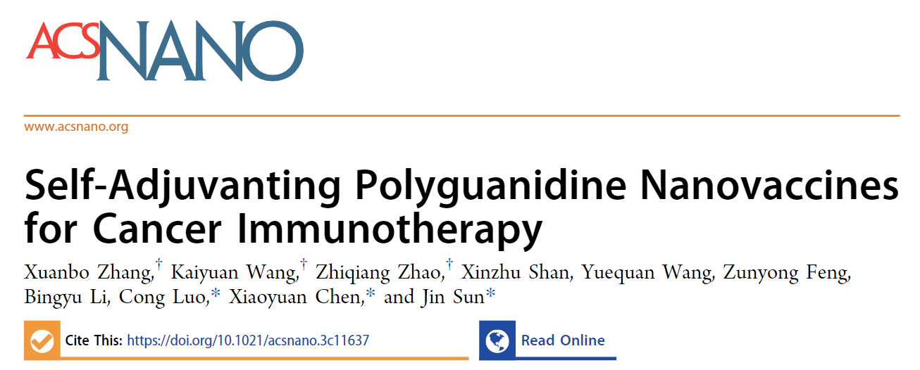 2024年2月26日,bat365正版唯一官网孙进/罗聪团队在美国化学会旗下期刊《ACS Nano》(IF=17.3)发表题为“Self-Adjuvanting Polyguanidine Nanovaccines for Cancer Immunotherapy”。bat365bat365正版唯一官网孙进教授和罗聪教授,新加坡国立大学陈小元教授为本文通讯作者,博士毕业生张轩博,王开元及2023级博士生赵志强为本文共同第一作者,bat365正版唯一官网为第一通讯单位。