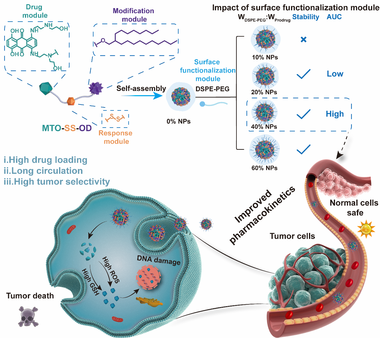近日,bat365正版唯一官网孙丙军教授在美国化学会旗下纳米科学和纳米技术顶级期刊《Nano Letters》(IF=10.8)在线发表题为“Probing the Impact of Surface Functionalization Module on the Performance of Mitoxantrone Prodrug Nanoassemblies: Improving the Effectiveness and Safety”的研究论文,设计了不同比例的表面功能化模块(DSPE-PEG2k)修饰的米托蒽醌前药自组装纳米粒,发现表面功能化模块的占比会显著影响前药自组装纳米粒的制剂学特征和体内命运。
