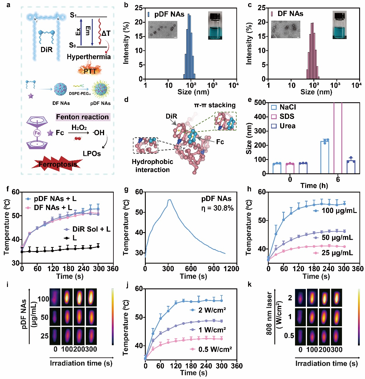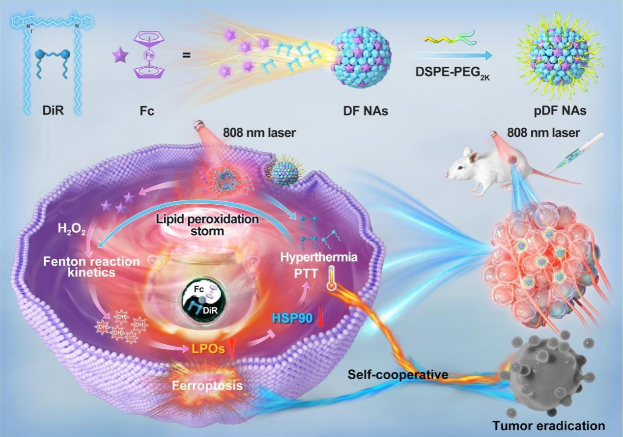 在这项研究中,作者针对肿瘤细胞内的铁含量有限及生理温度下芬顿反应进行速率缓慢的问题,提出以二茂铁(Fc)作为芬顿反应反应物促进肿瘤细胞铁超载,与光热光敏剂(DiR)通过一步纳米沉淀法制备成纳米组装体,并在其表面修饰20%(w/w)DSPE-PEG2K以提升其稳定性(pDF NAs)(图1)。其中,DiR诱导的过高热可加速Fc介导的芬顿反应动力学过程,促进高细胞毒性的·OH的积累,触发脂质过氧化风暴。此外,大量积累的脂质过氧化物(LPOs)及其代谢产物可通过破坏热休克蛋白(主要为热休克蛋白90,HSP90)的结构使肿瘤细胞对光热疗法敏感。