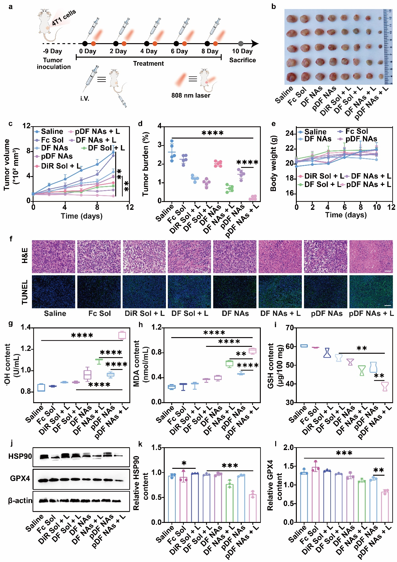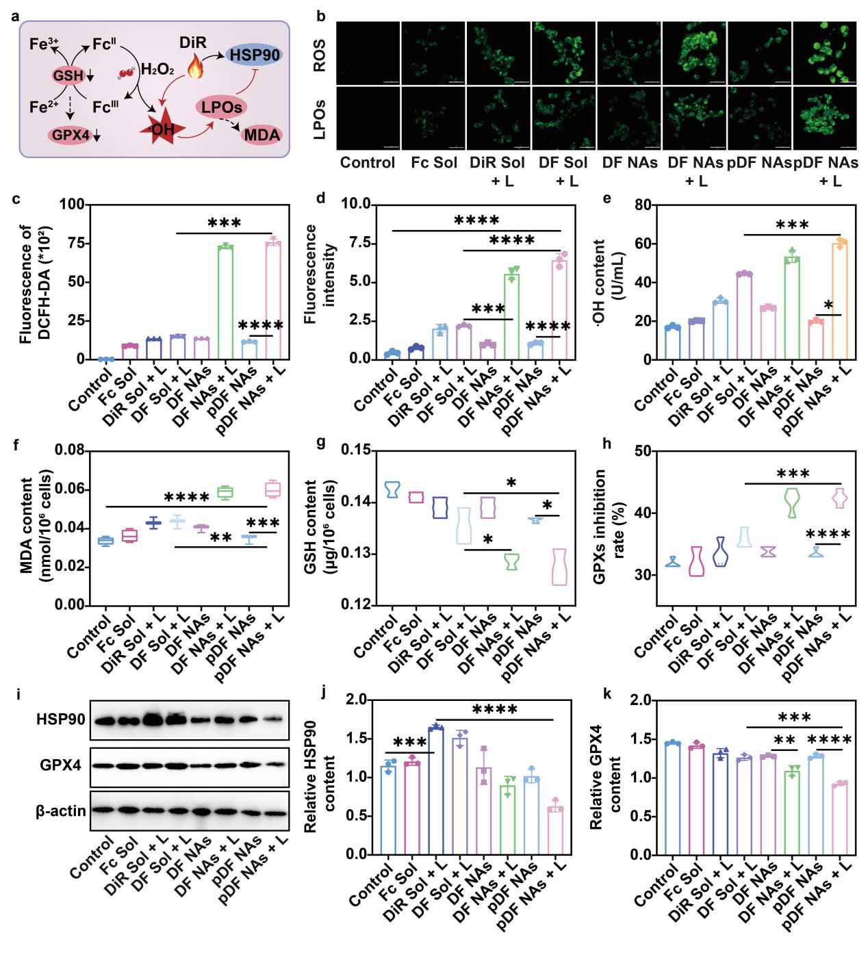 随后,作者通过测定4T1乳腺癌细胞中ROS、LPOs、·OH和MDA的含量,评估了不同制剂组诱导铁死亡的能力。结果显示,pDF NAs在808 nm近红外光照射的条件下(pDF NAs + L)诱导铁死亡的效果显著强于Fc Sol、DF Sol + L与非光照的pDF NAs组,这主要得益于其较好的细胞摄取与过高热促进的芬顿反应触发的脂质过氧化风暴。此外,由于剧烈的氧化应激可破坏细胞内的氧化还原稳态,促进氧化物质的积累,从而间接削弱肿瘤细胞的抗氧化系统。因此,作者进一步探究了细胞内GSH含量与GPXs抑制率水平。结果显示,pDF NAs + L可在一定程度上抑制GSH和GPX4的表达。最后,通过western blot实验验证了pDF NAs + L可抑制HSP90的表达,使4T1乳腺癌细胞对PTT疗效增敏(图4)。