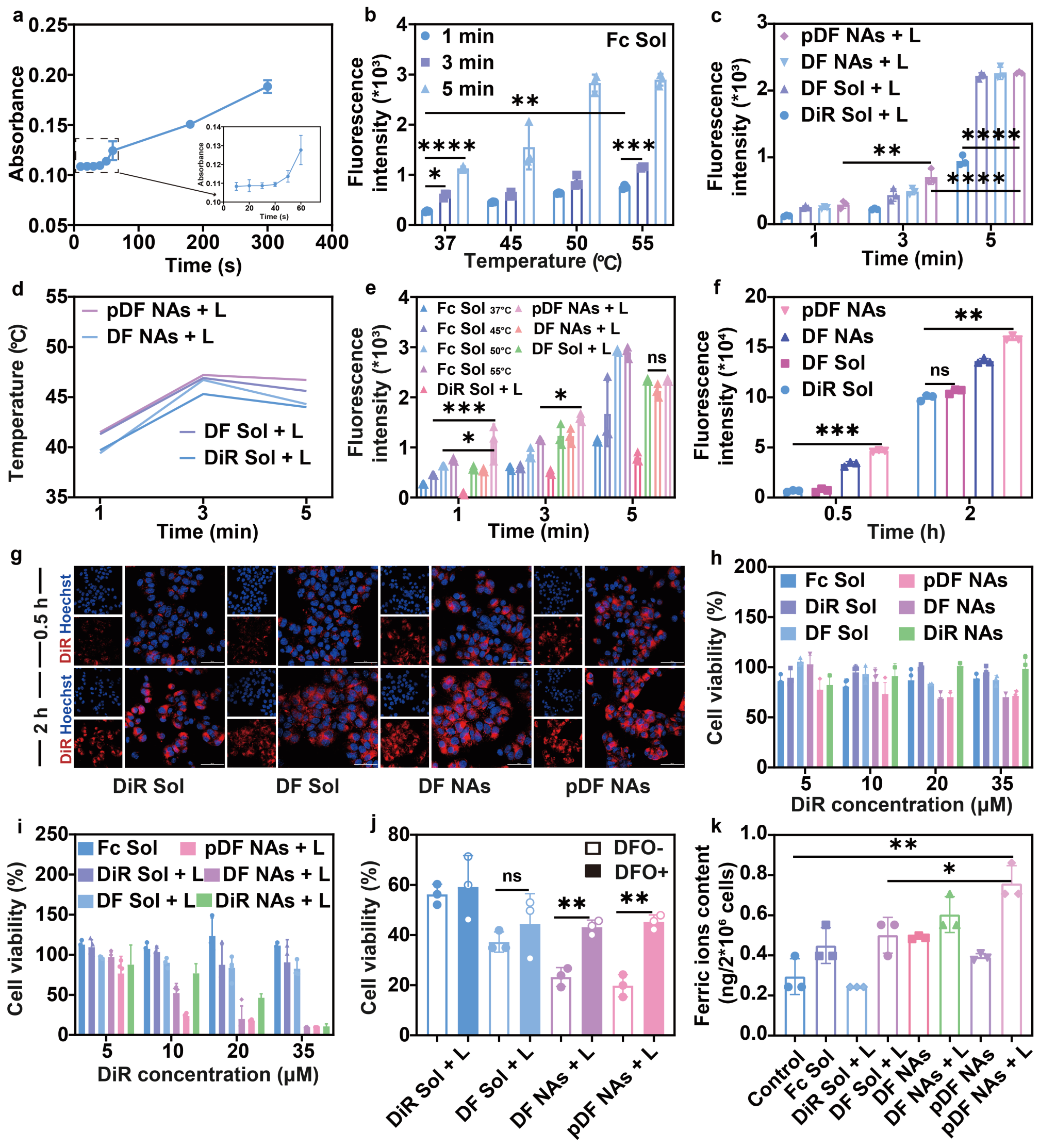 接下来,作者通过测定Bipy-Fc复合物的形成考察纳米组装体中光触发的Fc的释放行为。结果显示,随光照时间的延长,Bipy-Fc复合物在519 nm处的紫外吸收明显增强,表明808 nm近红外光照射可促进pDF NAs中Fc的快速释放,并具有光照时间依赖特性。其次,通过对苯二甲酸二钠捕获·OH的实验验证了Fc介导的芬顿反应具有温度和时间依赖特性,并且纳米组装体中DiR在808 nm近红外光下诱导的过高热可显著促进芬顿反应动力学过程,加速高细胞毒性的·OH的产生和蓄积。接下来,通过DiR自身的荧光特性考察了纳米组装体在4T1乳腺癌细胞中的摄取行为。实验表明,纳米组装体的形成提升了细胞摄取效率并具有时间依赖特性。并且,pDF NAs在808 nm近红外光照射的条件下对4T1乳腺癌细胞表现出最强的细胞毒性,这也进一步说明了纳米组装体的优势(图3)。