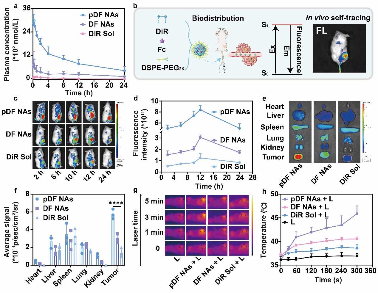 接下来,作者考察了纳米组装体的体内药动学行为。结果显示,pDF NAs具有显著延长的血液循环时间,这有利于其在肿瘤部位的高效蓄积。随后,作者建立了4T1乳腺癌荷瘤小鼠模型,通过体内分布实验探究了pDF NAs在小鼠体内的分布情况,表明它们可实现肿瘤部位特异性的蓄积。接下来,作者采用同样的动物模型,并通过近红外成像仪考察了pDF NAs的体内升温效应。结果表明,pDF NAs处理后的小鼠肿瘤部位表现出最显著的温度升高,有利于高效的肿瘤杀伤(图5)。