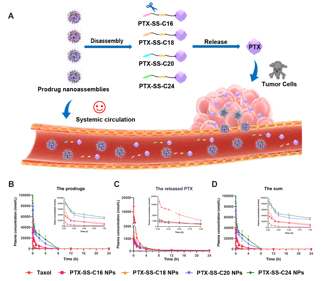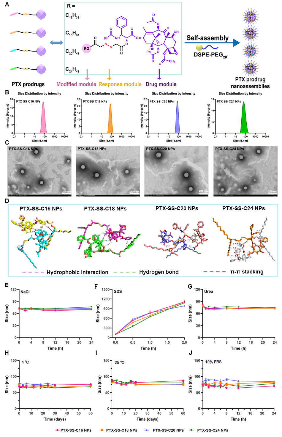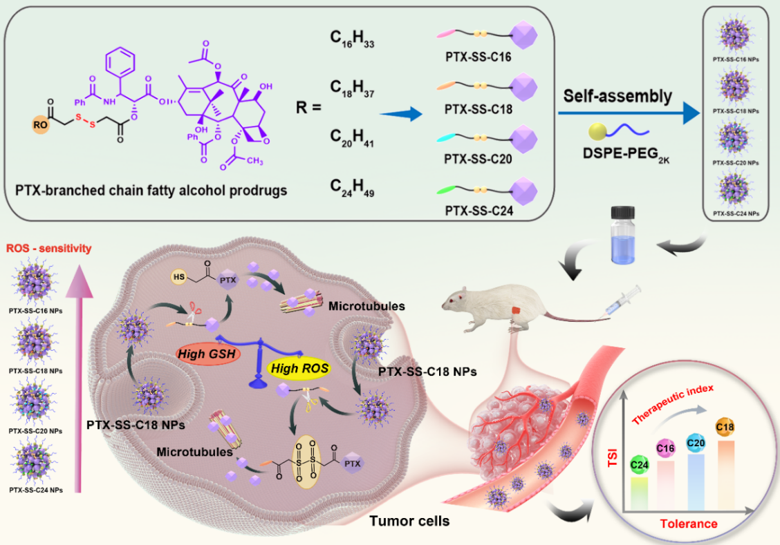 在这项研究中(图1),作者以二硫键为桥连设计了不同碳链长度支链脂肪醇修饰的紫杉醇前药纳米组装体(PTX-SS-C16 NPs、PTX-SS-C18 NPs、PTX-SS-C20 NPs、PTX-SS-C24 NPs),系统性考察了支链修饰模块的碳链长度对前药纳米组装体构效关系的影响,解析了不同前药纳米组装体在自组装能力、组装机制、氧化还原智能激活、体内命运、抗肿瘤疗效和耐受性等方面的差异。