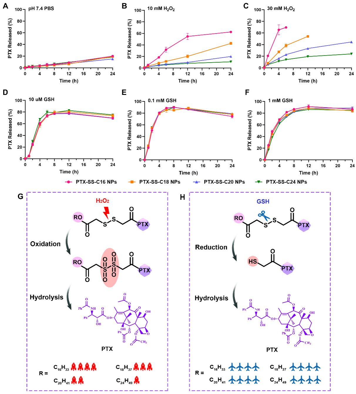 作者接着考察了前药纳米组装体的体外释放行为。如图3所示,修饰模块的碳链长度越短,前药纳米组装体的氧化敏感性越强,而还原敏感性几乎没有差异,其原因可通过对中间体的解析进行解释。在氧化条件下,二硫键被氧化成亲水性亚砜或砜,增加了整个体系的亲水性,促进了紫杉醇临近酯键的水解,而PTX-SS-C24具有最长的脂肪醇链和最强的疏水性,阻碍了水分子对酯键的进攻,因此氧化敏感性较弱。而还原条件下,由于四种前药纳米组装体产生相同的巯基中间体,因此释放速率相似。
