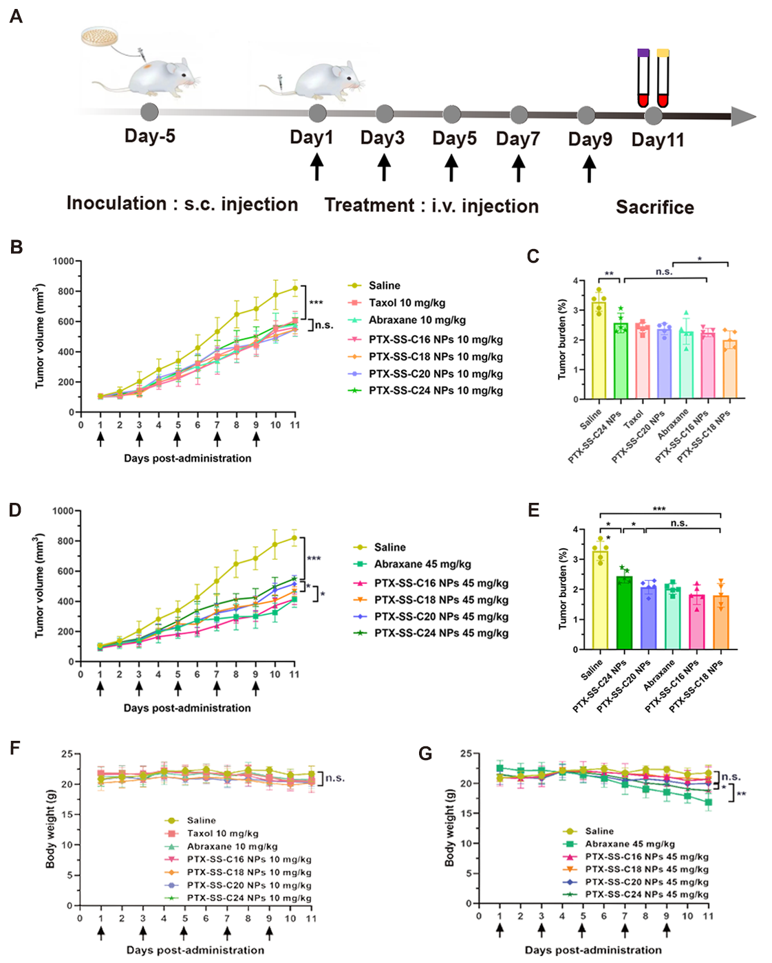作者接着考察了不同前药纳米组装体的抗肿瘤作用和安全性(图6)。在低剂量(10 mg/kg)下,由于PTX-SS-C18 NPs具有较强的氧化还原释药能力和较高的肿瘤选择性,因此,显示出优越的抗肿瘤效果和安全性,其抗肿瘤效果与市售的Abraxane(白蛋白结合型紫杉醇)相当。在高剂量(45 mg/kg)下,前药纳米组装体的抗肿瘤效果随着碳链长度的增加有降低的趋势。其中,PTX-SS-C16 NPs、PTX-SSC18 NPs和PTX-SS-C20 NPs无论在抗肿瘤作用还是在安全性方面均优于PTX-SS-C24 NPs。