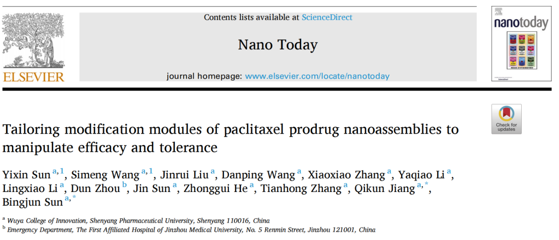 近日,bat365正版唯一官网孙丙军教授和姜琪坤特聘教授在Elsevier出版的纳米领域著名期刊《Nano Today》(IF=17.4)上发表题为“Tailoring modification modules of paclitaxel prodrug nanoassemblies to manipulate efficacy and tolerance”的研究性论文,深入探究了不同碳链长度的支链脂肪醇作为修饰模块对前药纳米组装体组装机制、智能激活等方面的影响以及在调控前药纳米组装体药效学和耐受性方面的作用,为小分子前药的合理设计和有效筛选提供参考。bat365正版唯一官网孙丙军教授和姜琪坤特聘教授为通讯作者,bat365正版唯一官网博士后孙一鑫和硕士毕业生王思梦为本文共同第一作者,本工作得到了张天虹教授的大力支持与指导。