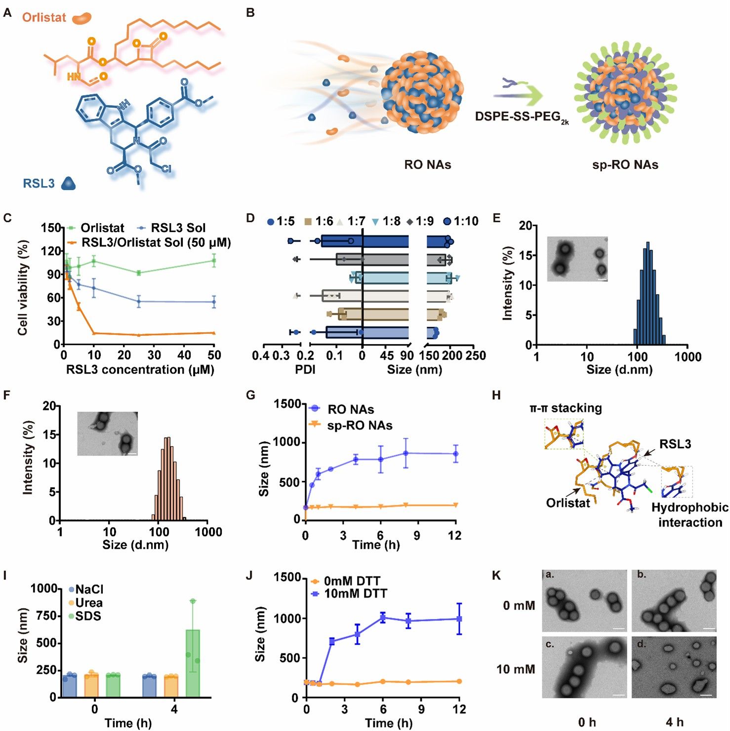 在这项研究中,作者提出了一种创新策略,旨在通过拆除铁死亡过程中的“最后一道防线(膜脂质屏障)”来放大铁死亡驱动的抗肿瘤作用。作者通过纳米组装技术和分子工程设计,构建了GPX4抑制剂(RSL3)和FASN抑制剂(Orlistat)的二元脂质纳米调节器(图1)。在组装过程中,RSL3和Orlistat可以自发组装成均匀的纳米组装体(RO NAs),进一步使用还原响应DSPE-SS-PEG 2K对RO NAs进行修饰,增强了纳米粒的稳定性并实现肿瘤特异性药物释放。值得注意的是,Orlistat本身是一个无细胞毒性的小分子化合物,通过抑制 FASN 来调节细胞膜脂质组成,促进多不饱和脂肪酸(PUFAs)的合成和积累。实验结果表明,与单独使用RSL3相比,无细胞毒性的Orlistat显著增强了 RSL3 对肿瘤细胞的细胞毒性,引发了强烈的铁死亡。最终,纳米调节器通过Orlistat和 RSL3 的联合诱导引发了剧烈的脂质过氧化风暴,成功瓦解了对抗铁死亡的“最后一道防线”,在 4T1 肿瘤小鼠中显示出良好的治疗效果。这项研究为开发铁死亡驱动的抗肿瘤纳米疗法提供了一个有效的范例,展示了分子工程在推进癌症治疗方式方面的潜力。