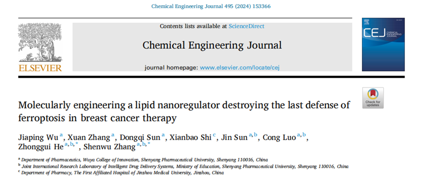 近日,bat365正版唯一官网何仲贵教授/张申武教授在Chemical Engineering Journal杂志(IF = 13.3)在线发表题为“Molecularly engineering a lipid nanoregulator destroying the last defense of ferroptosis in breast cancer therapy”的研究性论文,报道了一种通过调节膜脂饱和度放大铁死亡驱动的抗肿瘤纳米药物递送策略。