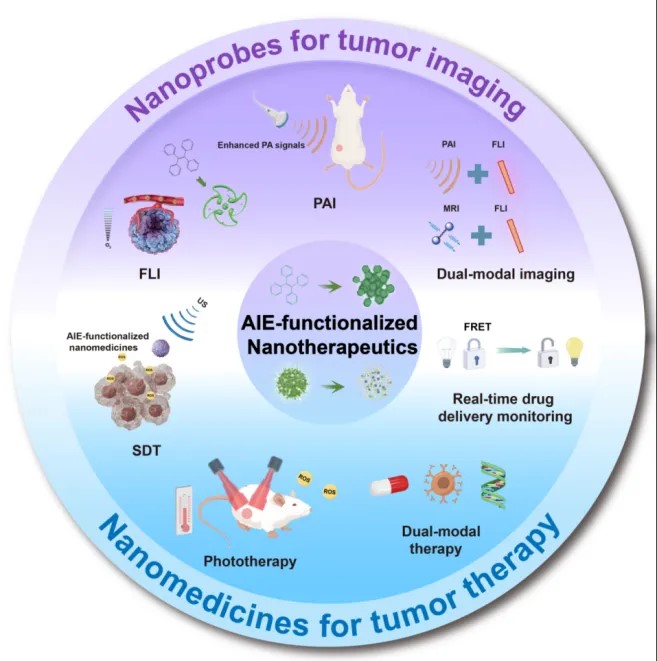 图1. 用于癌症诊断和治疗的AIEgen功能化纳米探针和纳米药物的示意图
