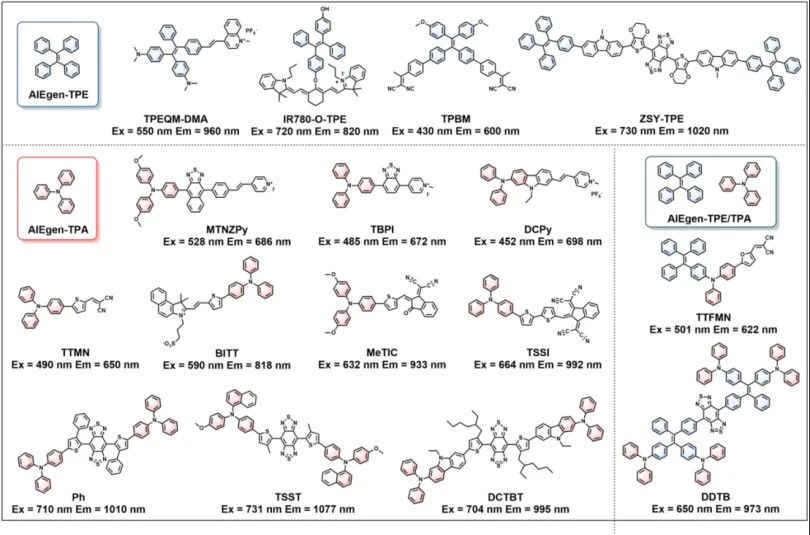 PEG-Azo-TPE、TPE-Azo、AWS-TPE、TPAQS-NO2、TNP、TPE-2E N-oxide、TPE-4NE-O和QM-HSP-CPP是肿瘤微环境响应的荧光成像AIE纳米探针;MASPB和TPNPDA-C12是细胞器靶向的荧光成像AIE纳米探针;2TPE-4E和2TPE-2T-BI是生物正交的荧光成像AIE纳米探针;IR775-Phe-Phe-Tyr(H2PO3)-OH和TPA-TQ3是光声成像AIE纳米探针;TB1、DTPA-TBZ和TBTO是兼具荧光和光声成像的AIE纳米探针;TB和NGd是兼具荧光和磁共振成像的AIE纳米探针。