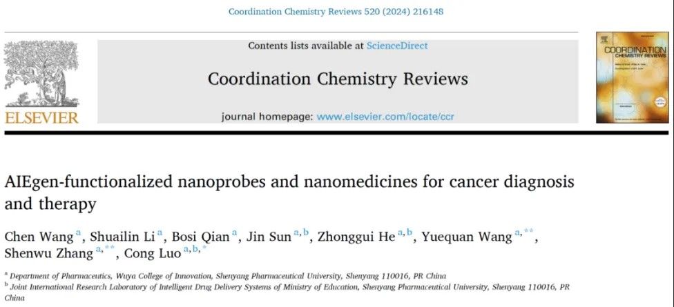 近日,bat365正版唯一官网罗聪教授课题组在期刊 Coordination Chemistry Reviews(IF = 20.3)上发表综述文献:AIEgen-functionalized Nanoprobes and Nanomedicines for Cancer Diagnosis and Therapy。bat365正版唯一官网罗聪教授、张申武教授、王悦全博士后为本文通讯作者,2022级博士生王晨为本文第一作者。