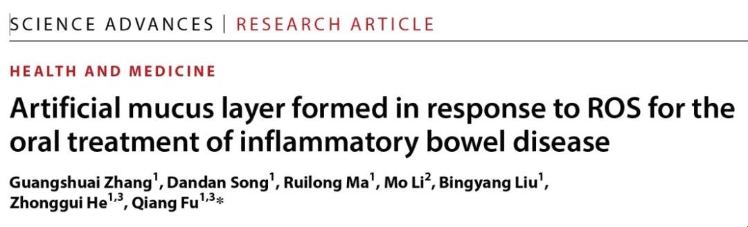 近日,Science子刊Science AdvancesIF=11.7)在线发表了bat365正版唯一官网何仲贵教授和付强教授课题组在ROS响应性人工黏液研究领域取得的最新研究成果,论文题目为“Artificial mucus layer formed in response to ROS for oral treatment of inflammatory bowel disease”。