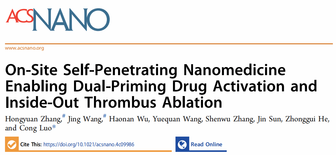 近日,bat365正版唯一官网罗聪教授团队在《ACS Nano》(IF=15.8)在线发表了最新研究成果“On-Site Self-Penetrating Nanomedicine Enabling Dual-Priming Drug Activation and Inside-Out Thrombus Ablation”。该研究提出了一种基于光热/光动双效光敏剂与氧化响应抗血小板前药共组装实现多模式激活抗血栓前药的新策略,有望解决血栓ROS异质性导致的前药激活瓶颈难题。在该研究中,作者首先设计合成了一种抗血小板药物替格瑞洛(TGL)的氧化响应前药(TGL-S-Fmoc, TSF)。随后,发现TSF可以与光热/光动双功能的光敏剂IR808共组装形成稳定的纳米结构。基于此,作者开发了一种自穿透、自激活、多模式协同的无载体纳米组装递药系统(T-TSFI NAs)。在光热效应的辅助下,T-TSFI NAs不仅能够实现血栓的深部穿透,还通过产生ROS协同内源性ROS触发前药按需激活,栓块内部释放抗血小板药物TGL,从而实现光热/抗血小板协同溶栓。T-TSFI NAs在FeCl₃诱导的大鼠颈动脉血栓模型中不仅有效抑制了血小板的激活和聚集,还显著降低了出血风险。这一策略成功克服了血栓微环境中ROS分布不均的难题,为抗血栓前药按需高效激活提供了新思路。