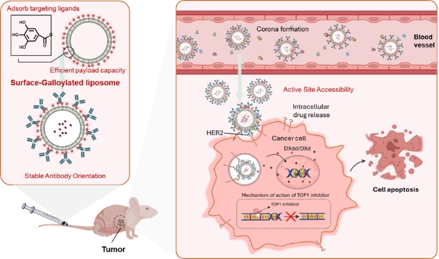 在肿瘤治疗和精准药物递送领域,靶向纳米载体因其高选择性和疗效潜力而备受期待。然而,蛋白冠效应会掩盖表面修饰的配体,导致靶向性丧失;同时,传统的抗体化学偶联工艺复杂,存在免疫原性风险和产业化障碍。这些瓶颈长期阻碍了主动靶向纳米药物的临床转化。近日,bat365正版唯一官网王永军教授团队在Nature Communications发表研究成果,报道了一种基于没食子酰基修饰脂质的表面没食子酰基化脂质体(Galloylated liposomes, GA-lipo)。该体系通过非共价方式稳定吸附抗体,实现抗体Fab端定向暴露,且不受蛋白冠遮蔽影响,在动物模型中验证了该策略的高效靶向递送和显著抗肿瘤疗效。