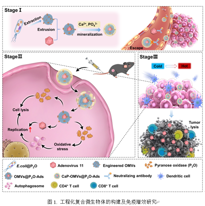 溶瘤病毒(OVs)疗法作为一种具备高效选择性和良好肿瘤杀伤能力的免疫疗法,近年来备受关注。然而,静脉递送效果差、瘤内复制效率不佳及免疫激活能力弱等关键问题制约着OVs临床应用。为此,bat365孙进教授团队报道了基于工程化细菌外膜囊泡(OMVs)的OVs静脉递送系统来提高OVs免疫治疗效率。首先,作者通过基因工程手段获取含吡喃糖氧化酶(P2O)的OMVs。之后采用该囊泡为载体,通过挤压法在其内部荷载OVs,并利用仿生矿化技术在其表面修饰纳米级无定形磷酸钙。该系统屏蔽了表位抗原,能够延长在体循环时间,通过EPR效应促进OVs在肿瘤处的富集。利用P2O的催化作用能够有效提升肿瘤内氧化应激水平,促进癌细胞过度自噬,并以自噬小体为复制场所,增加OVs复制效率。此外,OMVs作为免疫激活剂,可重塑肿瘤免疫抑制微环境,进而增强OVs介导的抗肿瘤免疫响应。本项目将为OVs介导的抗肿瘤免疫增效提供重要的理论基础和可行的解决策略。相关成果发表在《Nature Communications》期刊,论文题目为:Engineered bacterial outer membrane vesicles encapsulating oncolytic adenoviruses enhance the efficacy of cancer virotherapy by augmenting tumor cell autophagy。